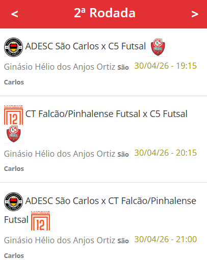 Depois da rodada desta quinta-feira em São Carlos, a terceira e última rodada da primeira fase será no dia 23 de maio em Chapecó, no Ginásio da AABB.