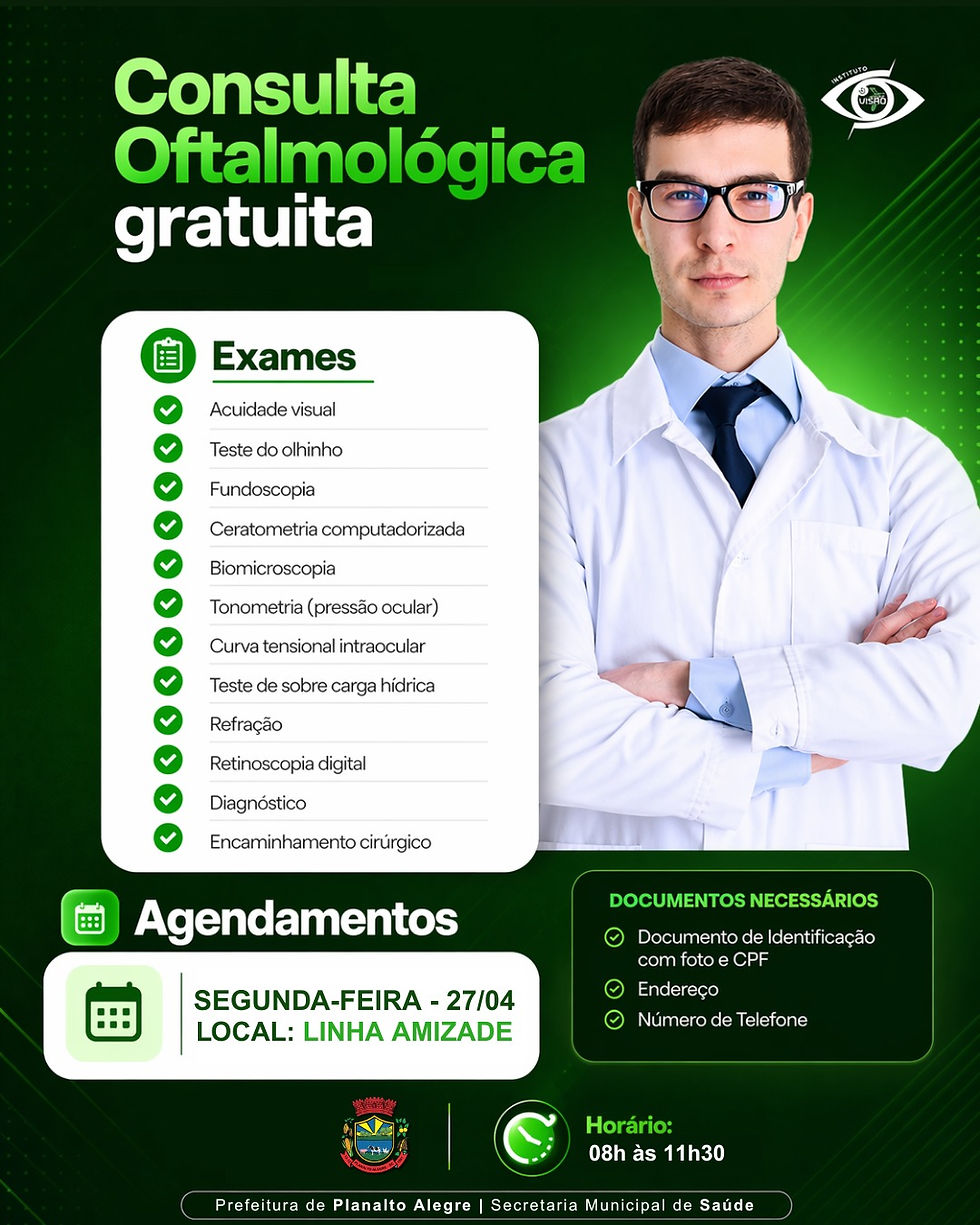A Secretaria de Saúde de Planalto Alegre está realizando agendamentos para consultas oftalmológicas.